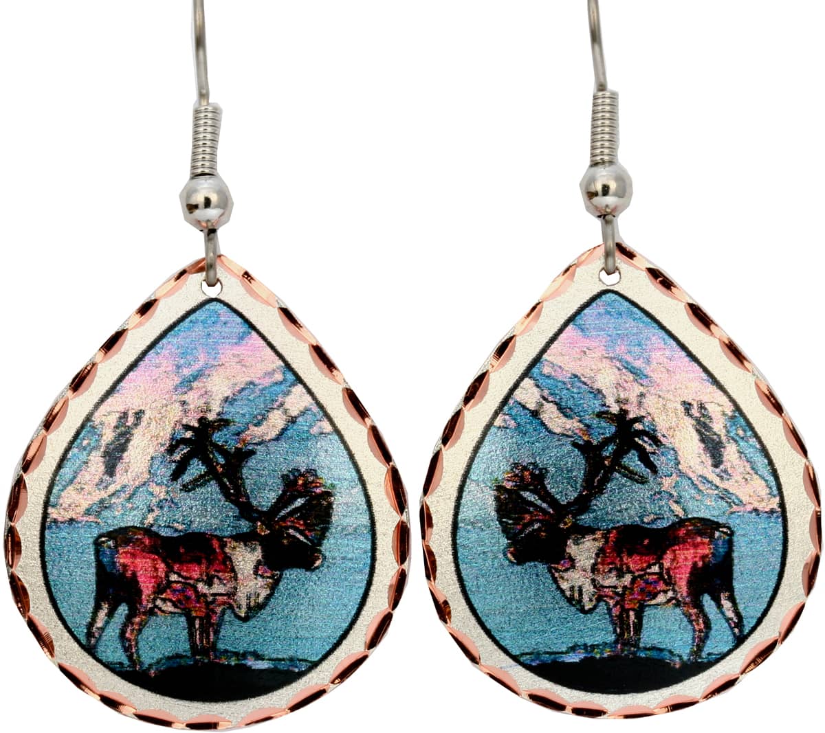 Alaska caribou earrings are skillfully crafted from copper in caribou and mountains artwork with vibrant colors. Buy caribou earrings exceptionally unique and exciting to wear. These stylish and original teardrop shape copper earrings with a pierced hole on top are 16.5 mm X 37 mm ( about 0.9 x 1 inch ) in size. Our lightweight earrings are always a pleasure to wear without the pain of heavy cast earrings. All our handmade earrings have surgical steel hypoallergenic ear wires so you can enjoy them without any discomfort. The origin of the caribou according to Native legends, once upon a time there were no caribou on the earth. But there was a man who wished for caribou, and he cut a hole deep in the ground, and up this hole came caribou, many caribou. The caribou came pouring out until the earth was almost covered with them. And when the man thought there were caribou enough for mankind, he closed up the hole again. Thus the caribou came upon the earth.