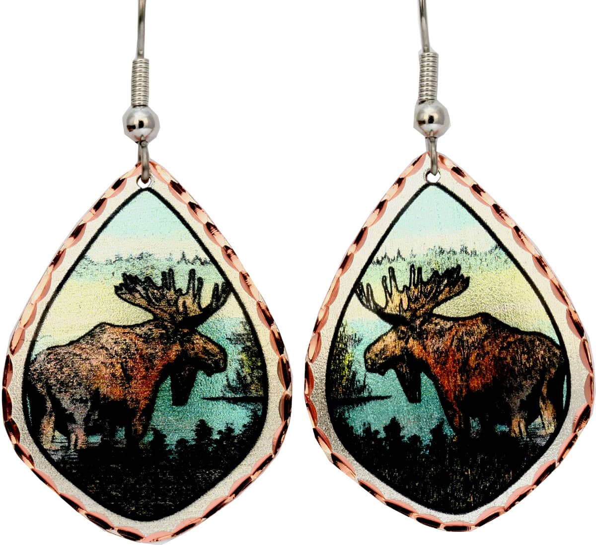 Alaska moose earrings handmade from copper in a colorful Alaska wildlife scene with sparkling diamond cuts. Buy unique Alaska jewelry earrings that are exquisite and safe to wear. These wonderful diamond shape earrings are 25 mm x 32.8 mm ( about 0.98 x 1.3 inches ) in size. These high-quality copper earrings will not irritate the skin. Our handmade Jewelry doesn’t tarnish. has a hard clear topcoat, but does not expose it to hair sprays, perfume, and cleaning chemicals. The moose symbolizes steadfastness, longevity, and wisdom. Handmade Alaska jewelry earrings will always be a perfect choice because they are original and very attractive.