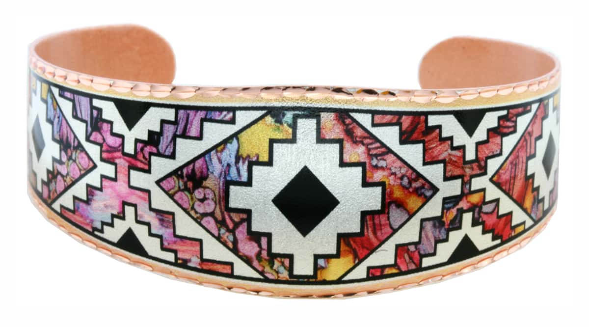 Alcohol ink Southwestern bracelets created from copper in elegantly and stylishly fashionable alcohol ink art. Buy Southwest Native alcohol ink bracelets to complement any western clothing. Every piece of our jewelry has at least 3 layers of protective finish so no polishing is required.