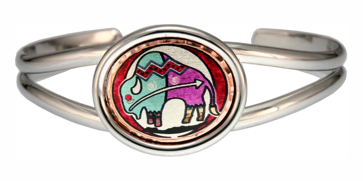 Native buffalo wire bracelet created from silver color wire style bracelet with an oval bezel decorated in colorful copper buffalo artwork. Buy this buffalo bracelet that is the perfect piece of jewelry for any occasion. This buffalo artwork represents endurance and longevity and will enable you to overcome obstacles to achieve greatness and success in your life. The Southwestern buffalo bracelet is a unique and eye-catching accessory that showcases the beauty of Southwest American culture. Made from high-quality copper, this bracelet features detailed buffalo artwork with intricate tribal patterns. The buffalo symbolizes strength, courage, and protection in Native American cultures, making this bracelet a meaningful and symbolic piece of jewelry. With its adjustable size, it can fit any wrist comfortably. This gorgeous Southwestern buffalo bracelet is a versatile and stylish addition to any jewelry collection, perfect for those who appreciate Native American art and culture.