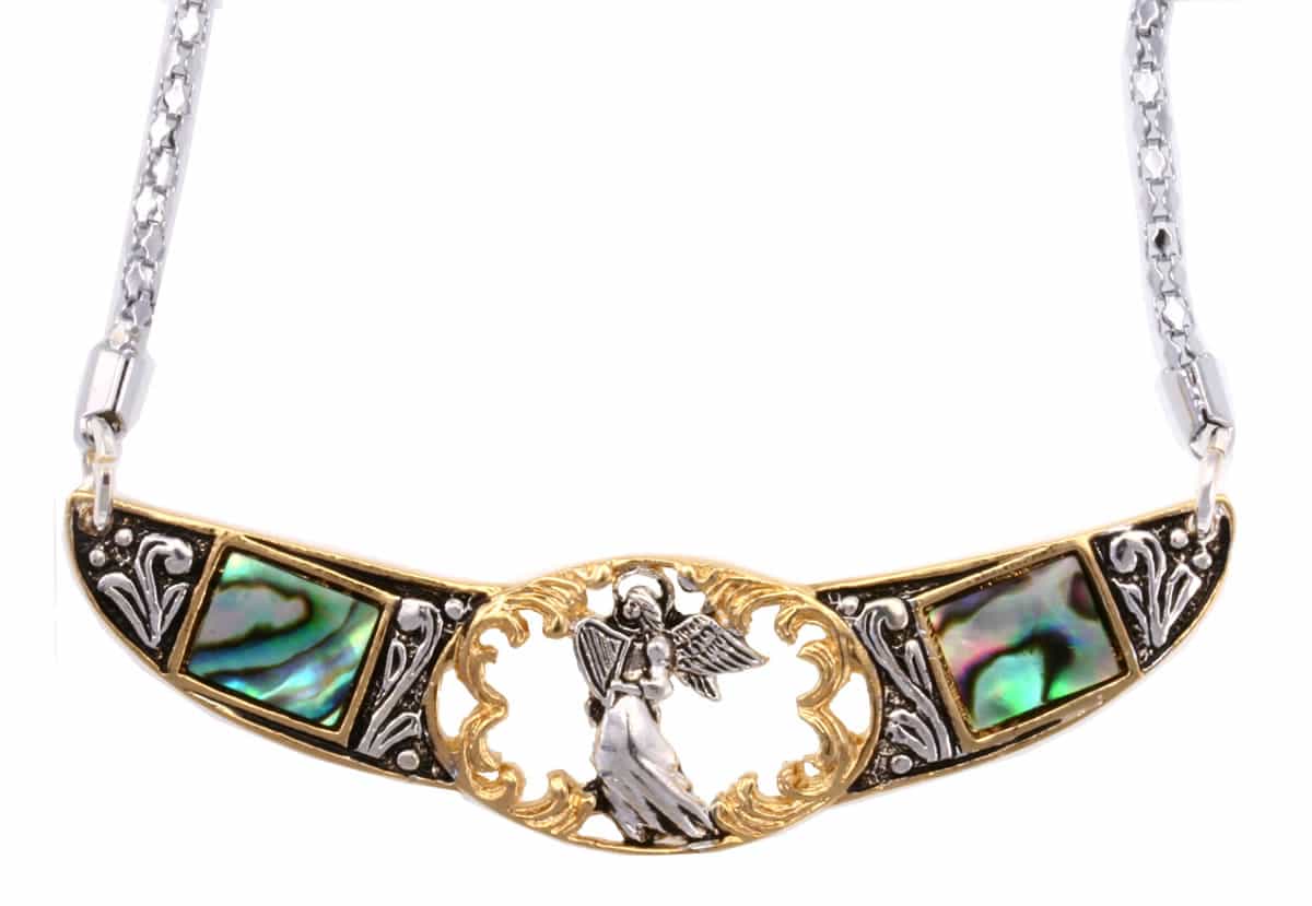 Unique chokers are two-tone gold and silver plated accented with colorful abalone shell inlays in this inspirational angel jewelry artwork. At Copper Reflections, we take pride in the quality of our unique jewelry, as well as our great customer service.