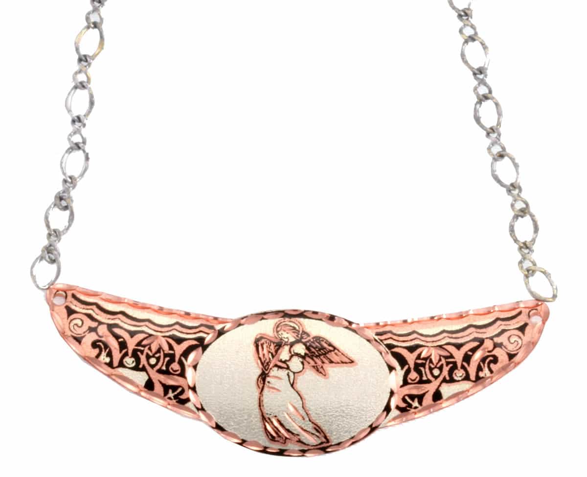 Angel choker crafted from copper in angel design with silver and black accents and sparkling diamond cuts for a luxurious look. Buy angel chokers for women who love to wear fashionable and stylish jewelry. Designed by highly skilled artisans, each piece is meticulously created to ensure flawless quality. The 18-inch dainty silver color chain adds a touch of femininity and grace to your neckline. With no need for polishing, this choker is easy to maintain and stays as dazzling as ever. Protected by multiple layers of finishes, it remains as stunning as the day you first wore it.