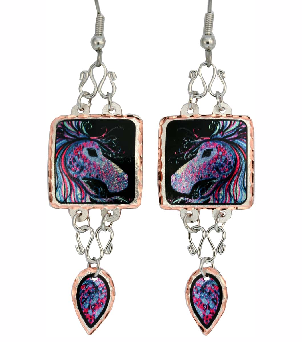 Colorful spotted horse earrings with wire dangles are handcrafted, silver plated and diamond cut on copper in this lovely horse artwork design by Nick Gustafson. Vibrant colors on a black background make these horse earrings dramatic and elegant.