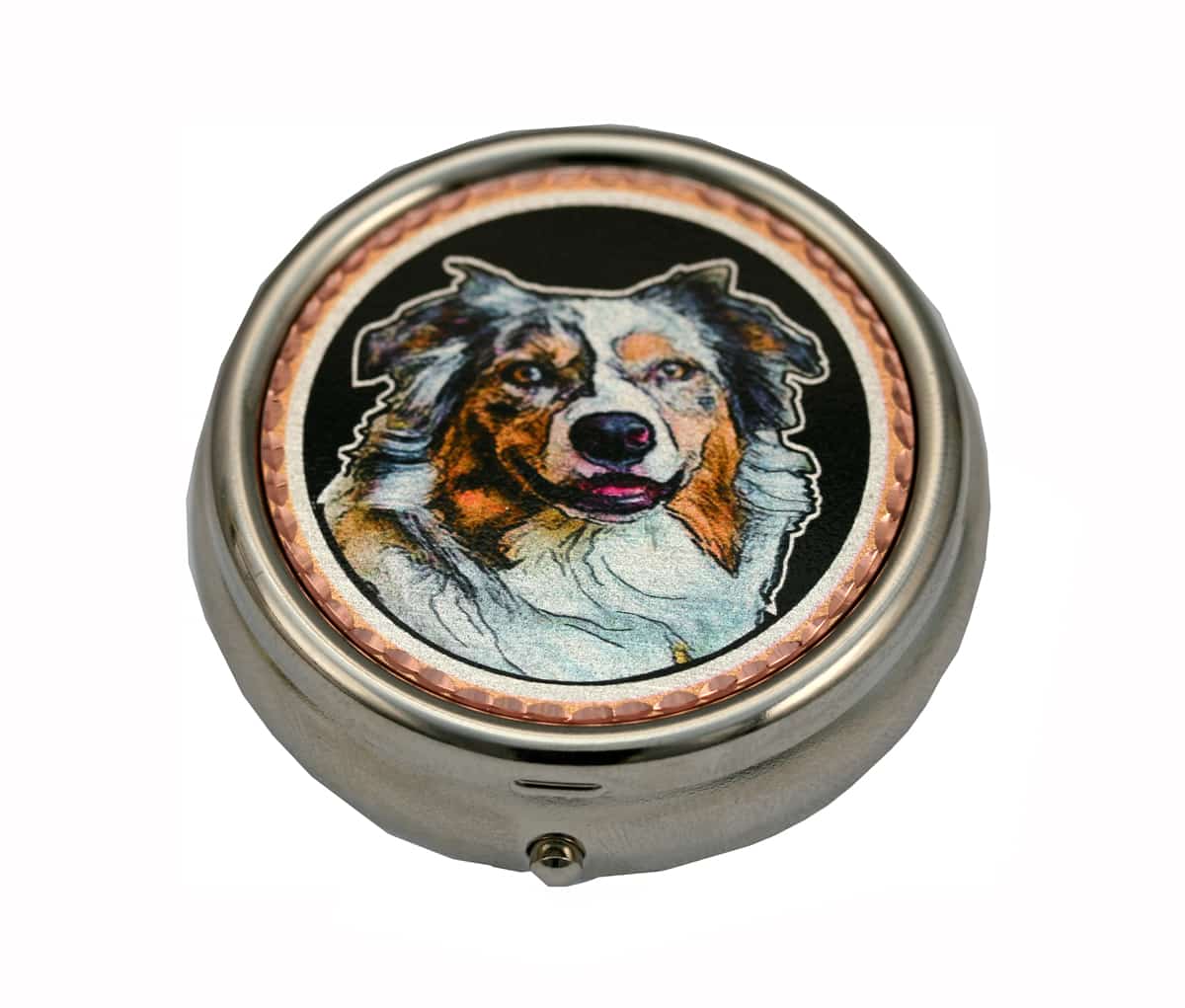Elegant pill boxes feature copper artwork that is handcrafted, silver plated and diamond cut in this Australian shepherd dog design. These unique dog pill boxes will make an unforgettable gift for dog lovers.