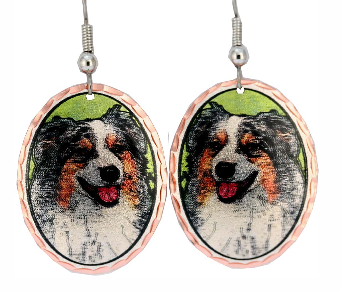 Australian shepherd earrings are skillfully crafted from copper in translucent colors and sparkling diamond cuts. Shop lightweight and quality dog earrings that you will get so many compliments on them. These pretty oval shape earrings are 22.5 mm X 29 mm ( about 0.9 x 1.15 inches ) in size. All our jewelry is nickel free. Each piece of our handmade jewelry has an acrylic coating to prevent tarnishing, so no polishing or special care is required.