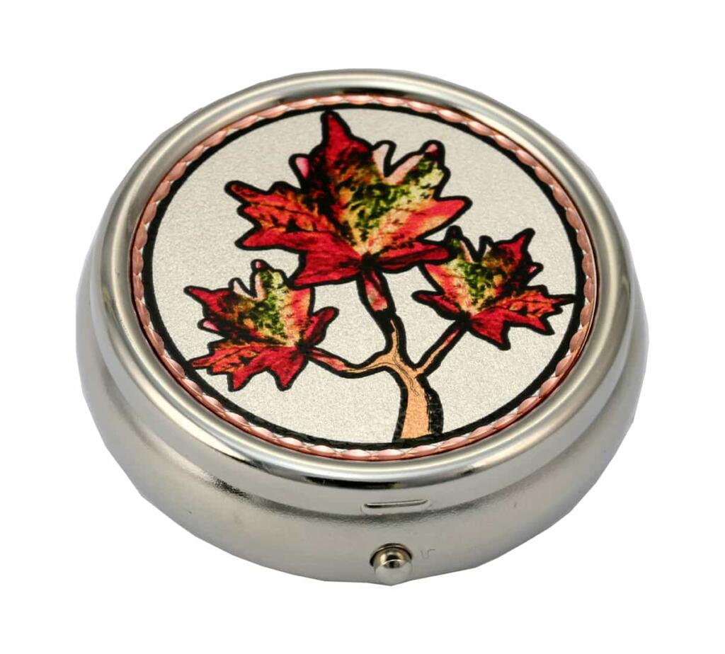Maple leaves in brilliant autumn colors handcrafted on these pill boxes will keep the memories of crisp fall days forever in mind. A great souvenir of Canada.