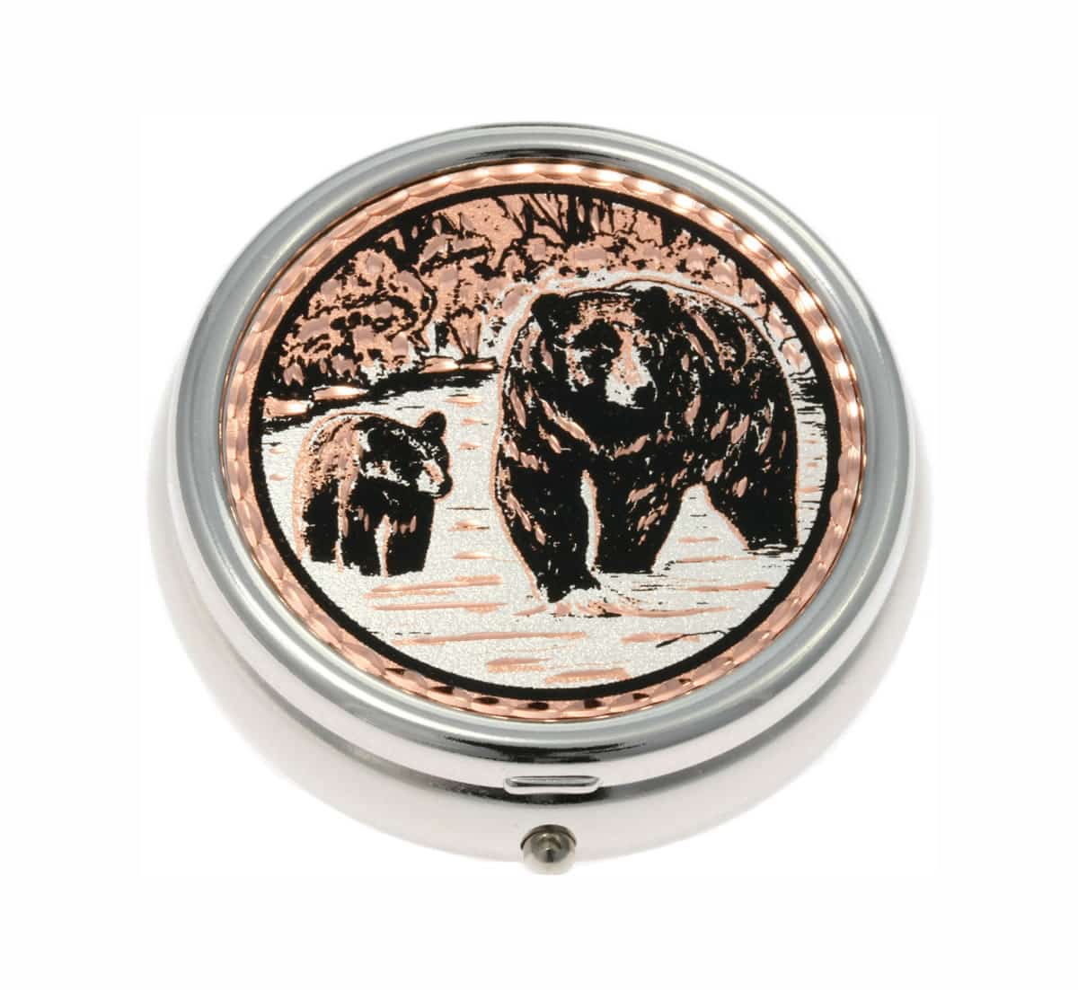 Pill boxes have individually handmade, silver plated and diamond cut copper artwork in this remarkable black bear and cub design. These pill boxes by Copper Reflections will make unique animal gifts for any occasion.