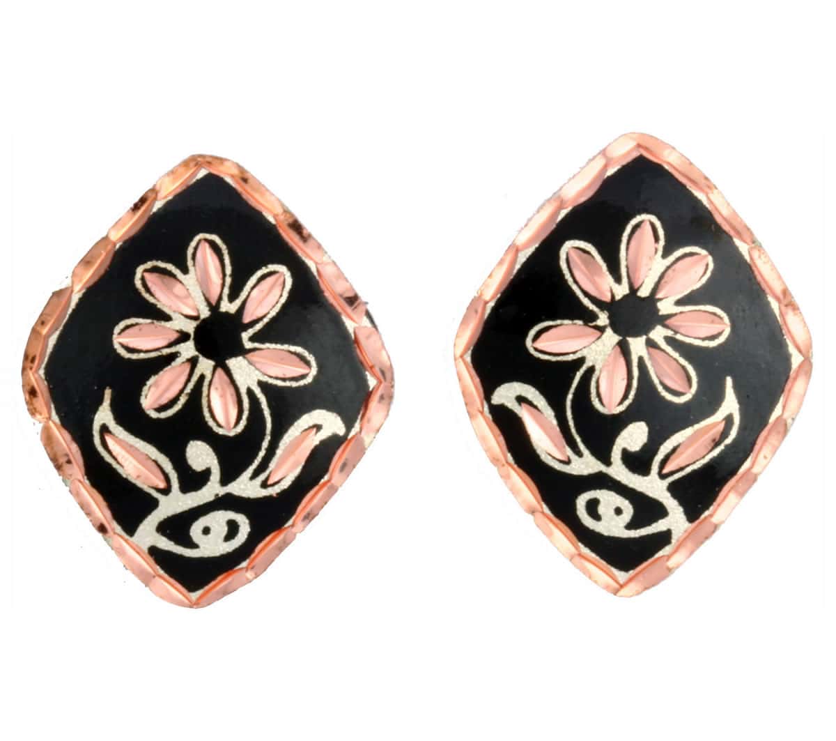 Black flower stud earrings are handmade from copper in a flower design with a black background. Buy flower stud earrings expensive-looking yet reasonably priced. Not only are these earrings dainty and lightweight, but they also feature hypoallergenic surgical steel stud backings, making them safe to wear even for those with sensitive skin. Say goodbye to irritation and hello to stylish comfort! At Copper Reflections, we pride ourselves on offering affordable handmade jewelry that exudes elegance and sophistication. Our vibrant colors will brighten up your days and add a touch of glamour to any outfit. These earrings are the perfect addition to your jewelry collection, suitable for every moment – whether it’s a casual day out or a special occasion.
