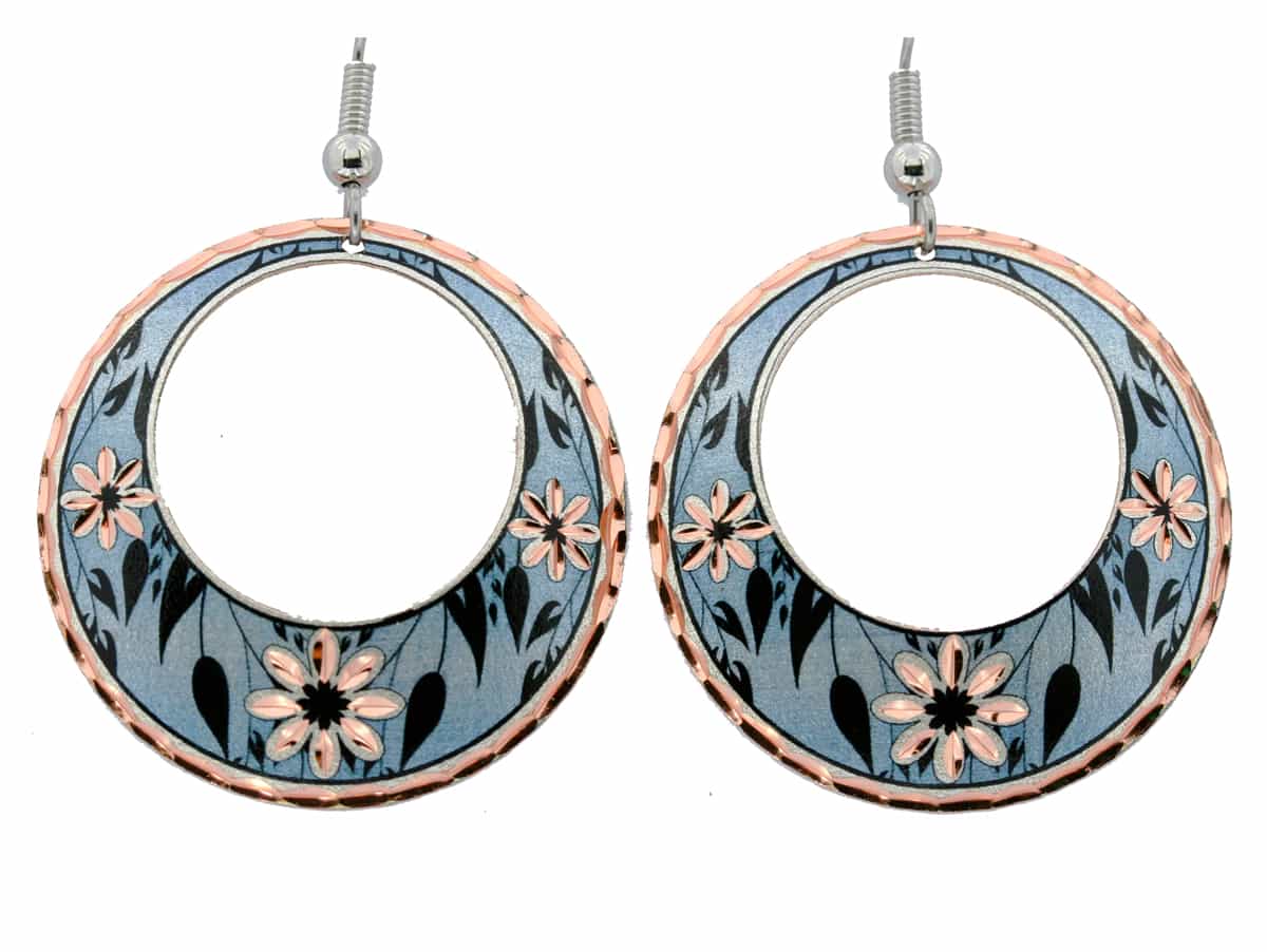 Amazingly attractive blue circle flower earrings made from copper by hand in pretty flower artwork with a silvery-blue background. Buy flower hoop earrings of fine quality and sold at a reasonable price. No polishing is required as they are coated with quality acrylic finishes.