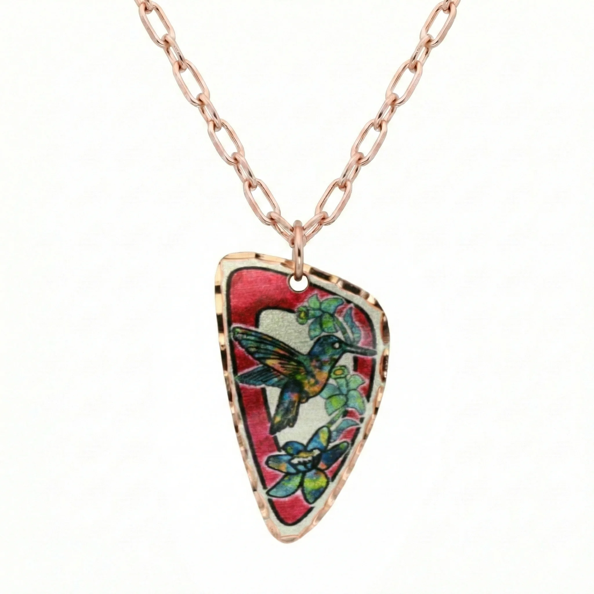 Capture the joyful beauty of nature with our Bright Color Pendant Hummingbird Necklace. Handcrafted from silver-plated pure copper, this vibrant pendant features breathtaking, bright artwork and hand-carved diamond cuts for a brilliant sparkle. Suspended on a beautiful 20-inch rose gold-plated chain and sealed with a no-polish acrylic finish, this unique, artisan-crafted piece is the perfect affordable luxury for any bird lover.