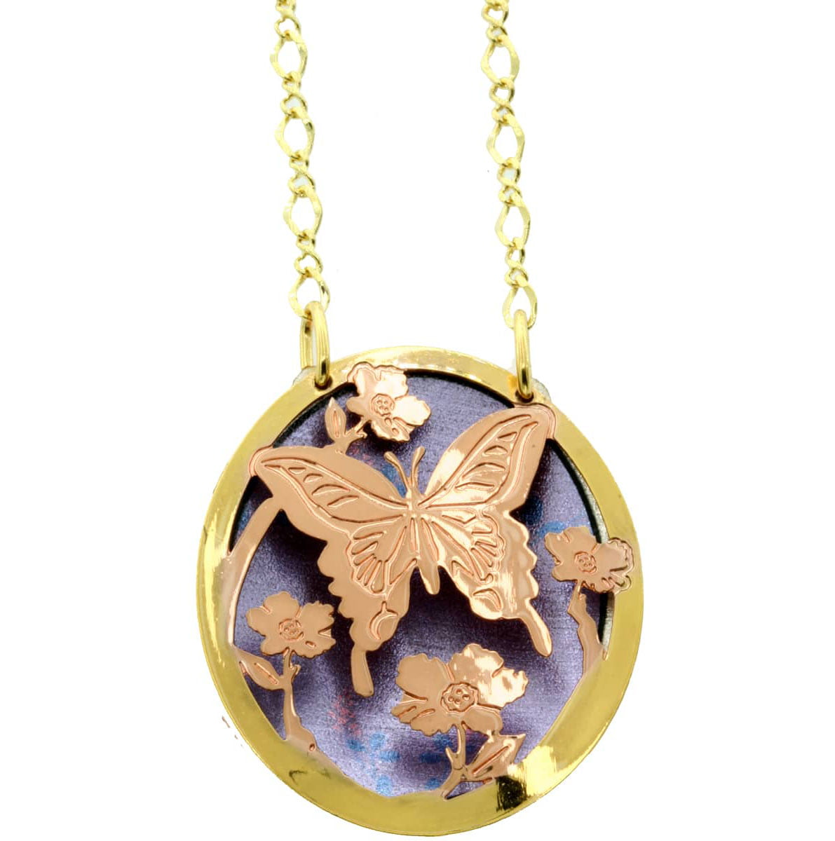 This graceful butterfly necklace is so pretty and feminine and you will not see them anywhere else. The design is etched through copper with a gold-filled border with a colorful copper art background to give this beautiful pendant a 3D effect.