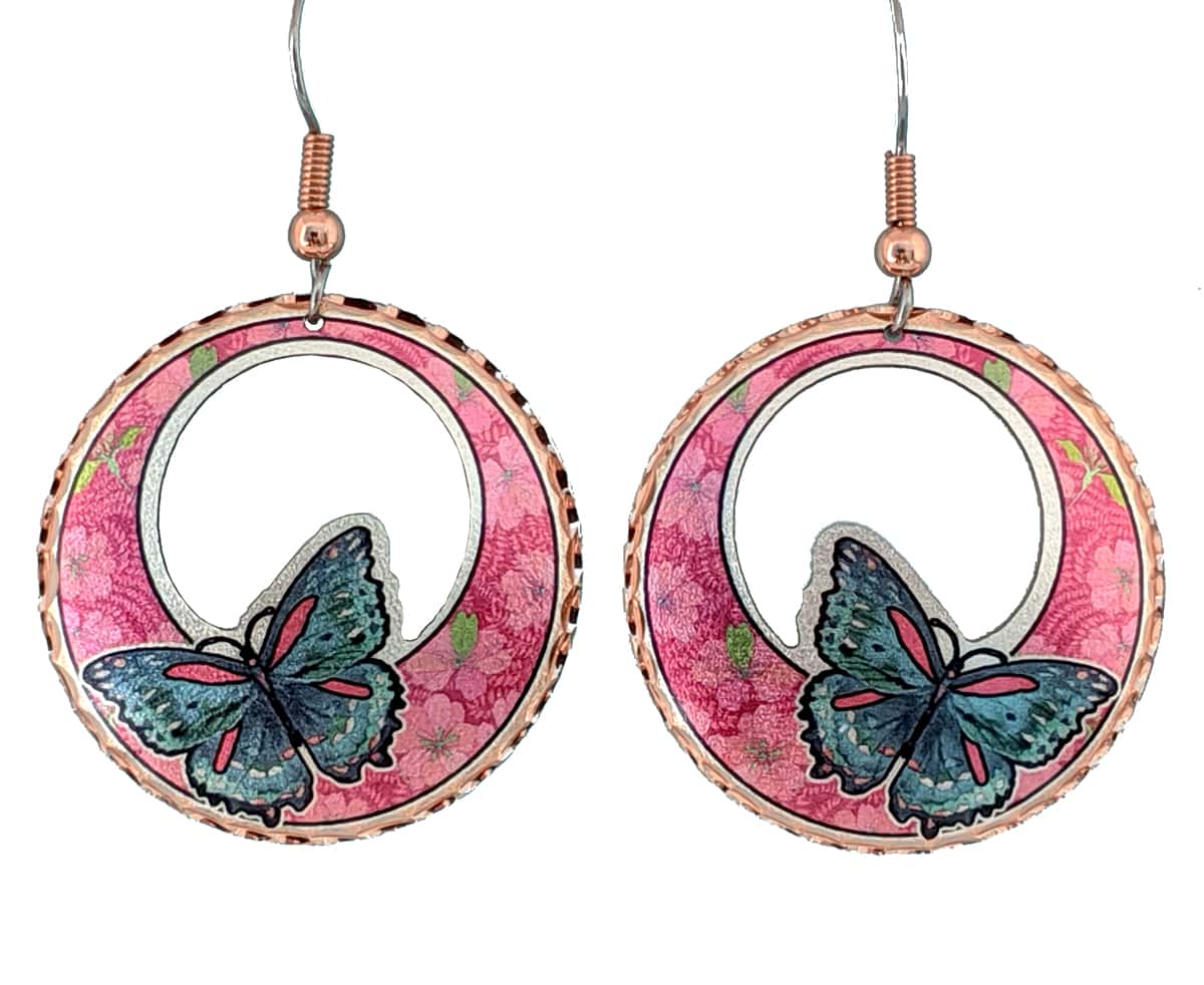 Cut Out butterfly earrings are made from copper in blue butterfly and pink background colors in the round with cut out. Buy extraordinary butterfly earrings that are feminine and luxurious. These pretty oval shape earrings are 26 mm X 28 mm ( about 1 inch) in size with cut out. Ear wires have the best quality surgical steel hypoallergenic so you can comfortably and safely wear them for a long time even if you have sensitive skin.