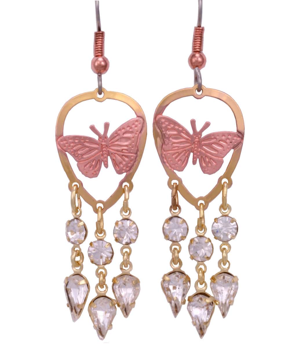 Crystal chandelier butterfly earrings are made from etched copper with a golden border and dangling crystals inset into bezels. Buy cute butterfly earrings that are handmade in high quality at affordable prices. Our lightweight earrings are always a pleasure to wear without the pain of heavy cast earrings. All our handmade earrings have surgical steel hypoallergenic ear wires so you can enjoy them without any discomfort.