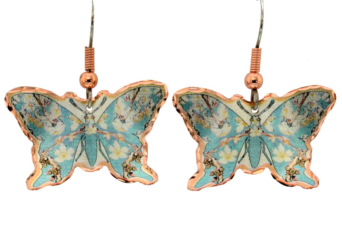 Butterfly Van Gogh almond blossom earrings made from butterfly shape copper in almond blossoms artwork. Buy feminine and unique almond blossom earrings that will never go out of fashion. Earrings are light in weight so you can wear them all the time without hurting your ears. Almond blossom earrings are pretty and safe to wear because they have the best quality surgical steel hypoallergenic ear wires.