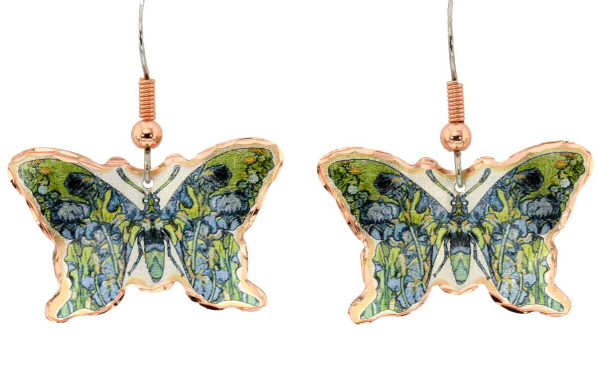 Butterfly Van Gogh irises earrings made from copper in pretty iris artwork. Buy amazing Van Gogh jewelry irises earrings to artfully adorn every outfit. These captivating earrings inspired by one of one the most famous paintings of Vincent Van Gogh will never go out of fashion. We design stunning handmade jewelry that is close to your heart. Let our unique iris flower earrings enhance your beauty.
