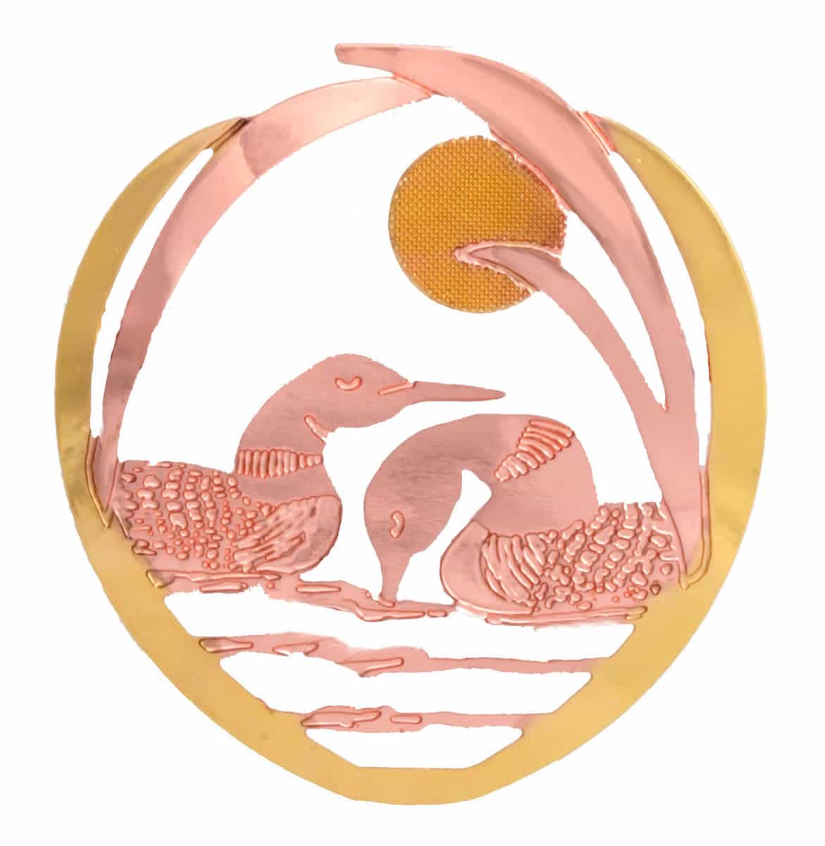 Loons brooch are created in two-tone jewelry brooches copper and gold in two loons swimming in a lake etched design. Buy a unique cut-out loon brooch for women who love quality and unusual jewelry that no one else has seen before. Are you ready to make a statement with your style? Introducing our exquisite Loons brooches, meticulously crafted from copper with gold-plated borders. These unique pieces showcase cut-out, etched designs with fine details that will captivate everyone around you. Our women’s jewelry brooches are designed to impress and delight. The brooch backings are securely soldered, ensuring they stay in place wherever you go. Plus, these brooches require no maintenance thanks to the multiple layers of protective finishes that keep them looking as stunning as the day you first wore them.