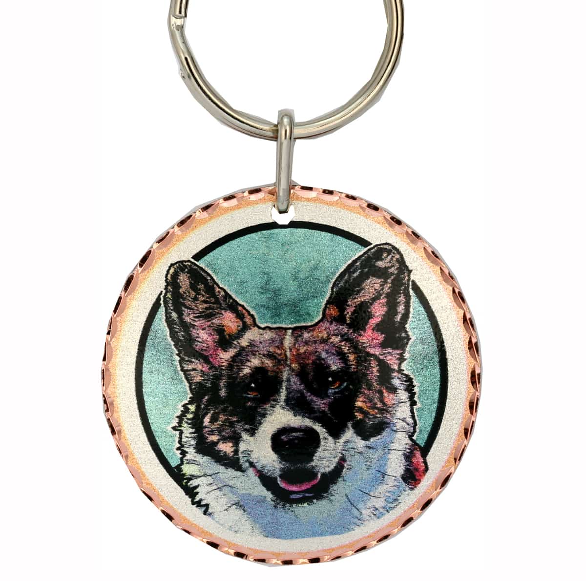 Cardigan welsh corgi dog keychain is handcrafted from copper, silver-plated, and diamond cut to sparkle in this colorful corgi design. Buy unique dog design keychains for your keys. These wonderful key chains make a unique gift choice for friends and family who love dogs. These cute dog key chains are a convenient way to keep your keys altogether and organized.