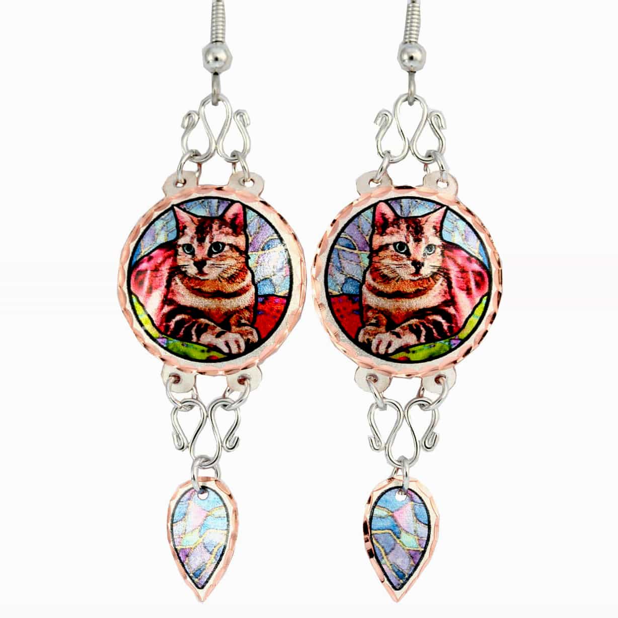 Lovely cat wire earrings handmade in colorful tabby cat design with wire accents. Purchase cute cat wire earrings effortlessly feminine and stylish.