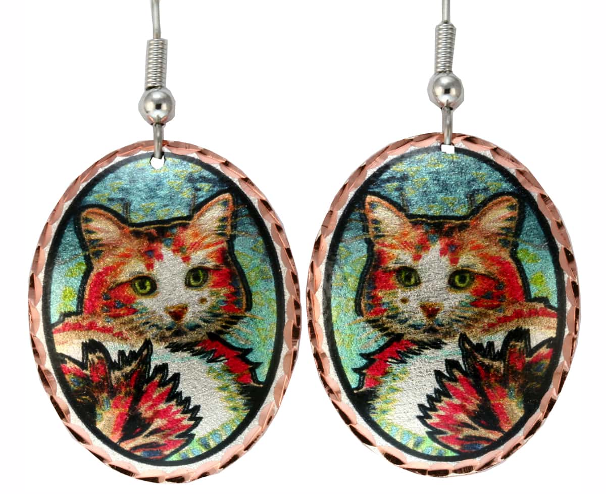 Ginger cat earrings are handmade from cute cat artwork with vibrant colors and sparkling diamond cuts. Buy lovely cat earrings for women who love cats. Introducing the colorful copper cat earrings, a masterpiece of artistry and elegance! Handmade with love by Copper Reflections, these unique earrings are crafted from copper and silver plated to perfection. The vibrant colors and sparkling diamond cut create a mesmerizing effect that is sure to impress everyone around you. These pretty oval-shaped earrings are 22.5 mm X 29 mm ( about 0.9 x 1.15 inches ) in size. Each pair of earrings is meticulously handcrafted with delicate details and high craftsmanship quality. The surgical steel hypoallergenic ear wires ensure comfort and durability, making them perfect for everyday wear. Coated with lacquer finishes, these earrings will never tarnish, maintaining their exquisite shine for years to come.