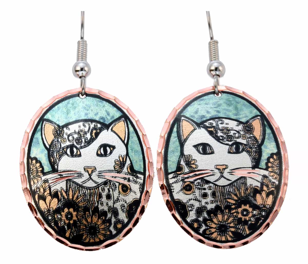 Presenting our exquisite collection of Colorful Cat Earrings, a masterpiece handcrafted by the talented artisans at Copper Reflections. These unique and eye-catching earrings are unlike anything you’ve ever seen before. Each pair is meticulously crafted from copper, ensuring durability and a luxurious look. The diamond cutting adds a touch of sparkle, making them truly stand out. Our earrings are nickel-free and coated with lacquer to prevent tarnishing, ensuring hassle-free maintenance and long-lasting beauty. We prioritize your comfort and safety, which is why our earrings feature surgical steel hypoallergenic ear wires. They are easy to put on with the convenient French hook design, allowing you to effortlessly add a touch of artisan-crafted sophistication to any outfit.