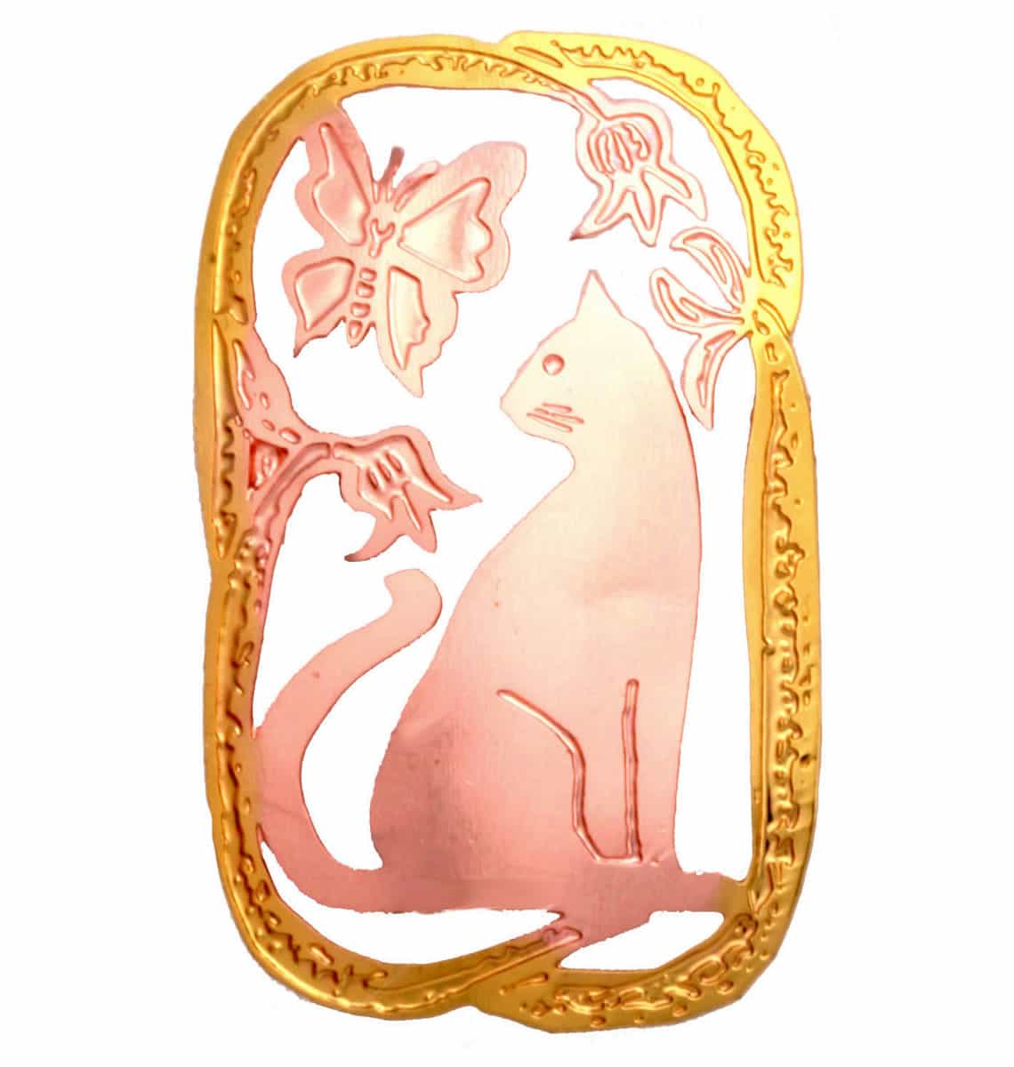 Cut out cat brooch delicately handcrafted in pretty cat & flower design with copper golden colors. Shop amazing wholesale artisan jewelry feminine cat brooches. We strive to create and develop the most original and unique ideas so our customers always have new fresh lines to choose from and are happy with their orders. Copper Reflections is the best online handmade jewelry store if you are looking for something out of the ordinary. Buy unique copper cut out cat brooch with gold highlights.
