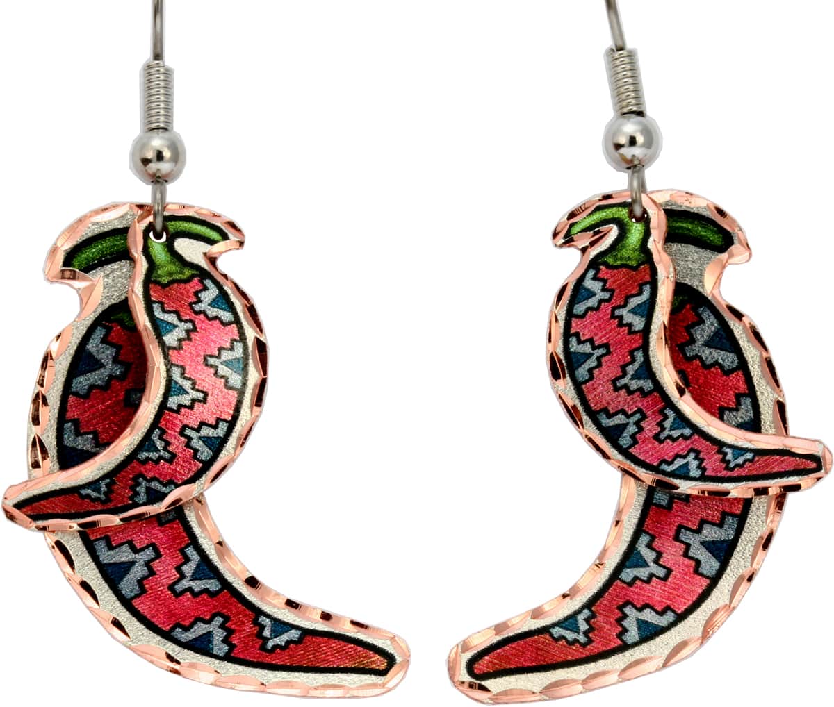 Colorful handmade earrings with two pieces in Southwest Native inspired chili pepper designs that are silver plated and diamond cut on copper. These unique chili pepper earrings will make a great souvenir of the Southwest.