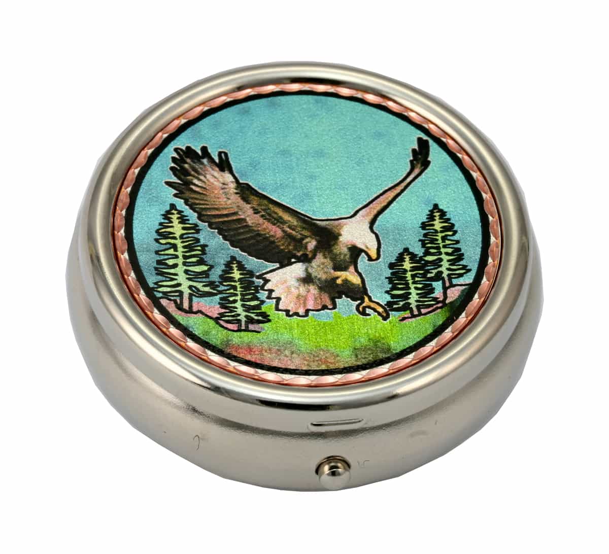 American eagle pill box is silver in color with plastic compartments and decorated with colorful copper artwork. Buy wholesale eagle gifts that you can not find elsewhere. Round rhodium-plated pill boxes are 4.5 cm in diameter and 2 cm high ( 1.78 inches in diameter and 0.79 inches high ) with plastic compartments. If you are looking for a handmade gift for men that is cool and does not need any maintenance, this unique pill box is the perfect choice for you! Because the eagle flies so high in the sky, it is common for Native Indians to believe eagles are emissaries from heaven that carry your hopes and dreams.