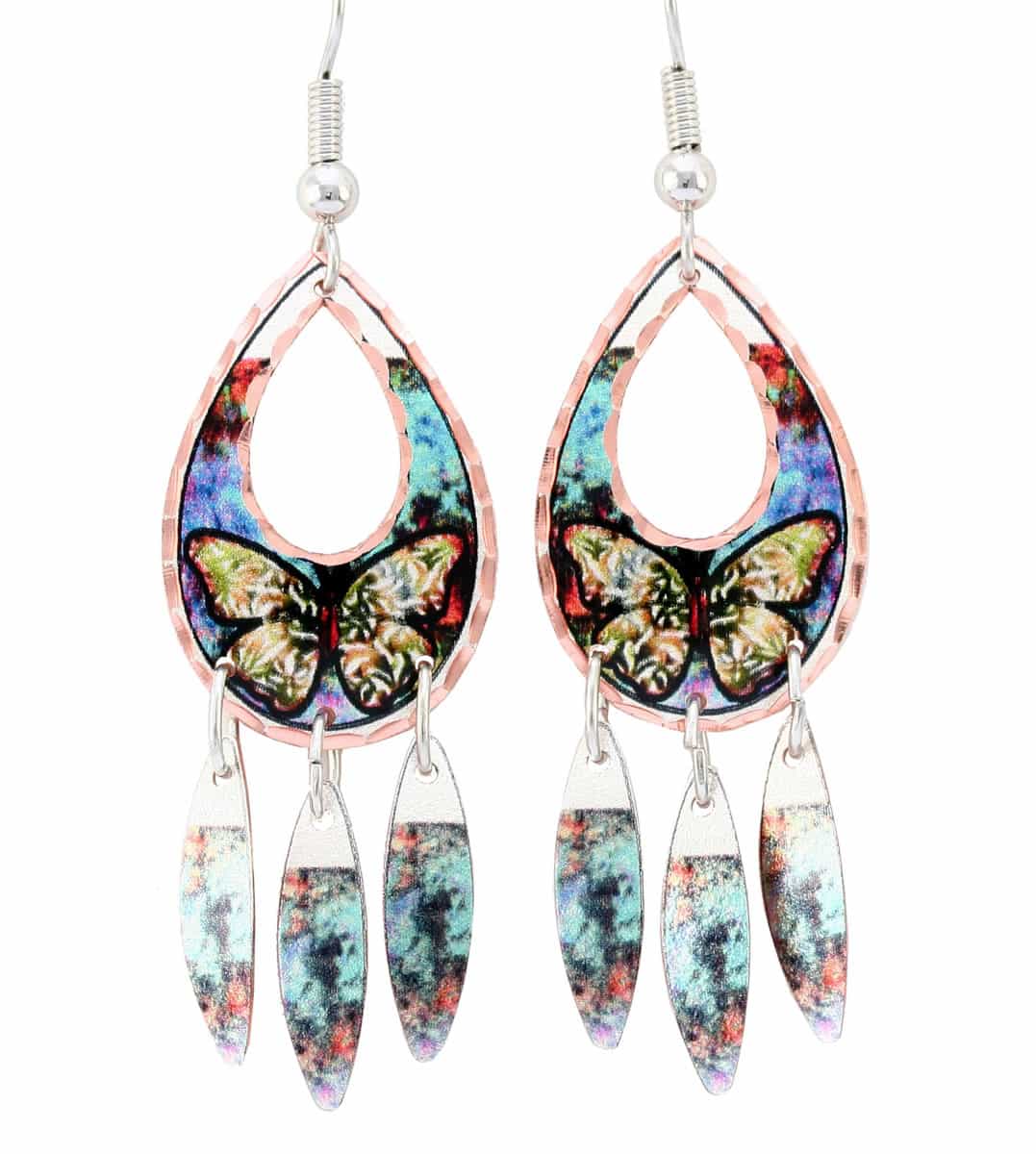 Colorful handmade earrings with butterfly design and three dangles are handcrafted, silver plated and diamond cut on copper. The butterfly symbolizes grace and elegance.