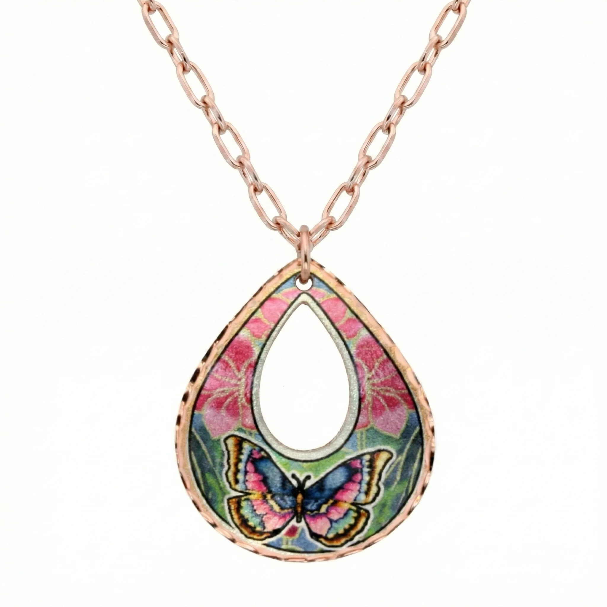 Stand out from the crowd with our Colorful Copper Butterfly Necklace. Handmade from silver-plated copper, this nature-inspired pendant features breathtaking, vibrant artwork and sparkling diamond cuts for a luxurious look. Complete with a 20-inch copper-tone chain and an anti-tarnish acrylic finish, this affordable piece of wearable art is truly unique. Because you deserve to be the center of attention every time and in any place, make this gorgeous, artisan-crafted necklace yours without breaking the bank.