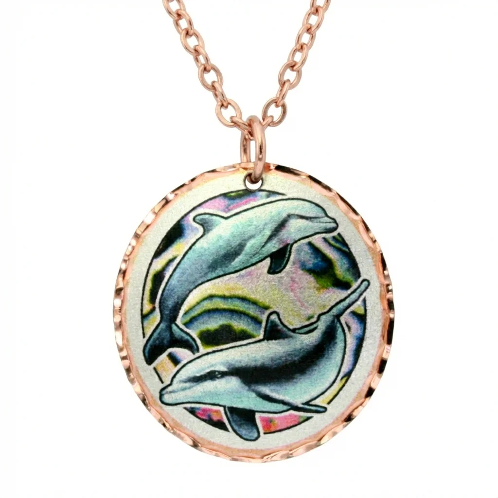 Colorful copper dolphin necklace handcrafted from copper in mesmerizing colors and sparkling diamond cuts. Shop copper dolphin necklace for women. Make a spectacular statement with our luxurious, handcrafted colorful copper dolphin necklaces. Since 1985, Copper Reflections has specialized in creating distinct, out-of-the-ordinary jewelry that stands apart from mass-produced accessories. Our skilled artisans craft every piece individually, focusing on breathtaking, colorful artwork that captures the enchanting spirit of the dolphin diving through the waves.