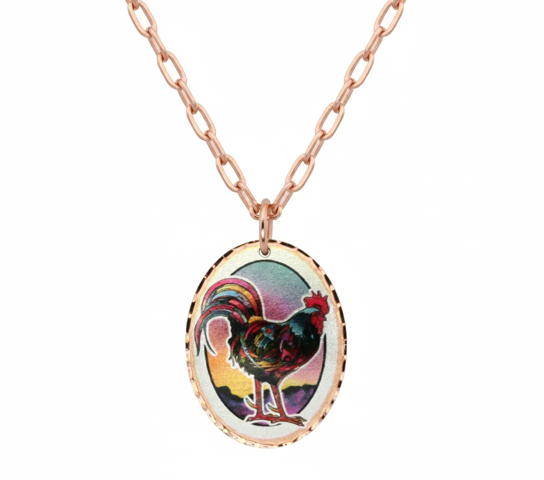 Handmade from copper and beautifully silver-plated, this pendant showcases a stunning rooster design enhanced with translucent colors and vibrant artwork. Each piece is meticulously diamond-cut to catch the light and sparkle for a truly luxurious look. It arrives ready to wear on a beautiful 20-inch-long copper-tone chain. Best of all, no polishing is required—your pendant is protected by multiple layers of a durable acrylic finish, ensuring it stays pristine and radiant day after day.