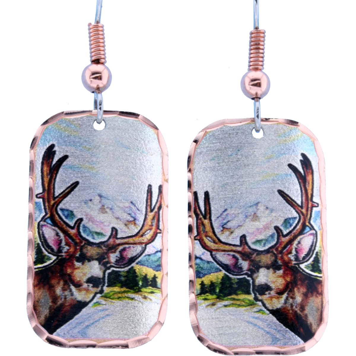 Deer earrings are artisan-crafted from copper in original watercolor artwork by Lynn Bean. Purchase delicate wholesale wildlife art jewelry earrings. You will be amazed by the fine details, high quality, and originality of our handmade colorful copper earrings in a rectangular shape.