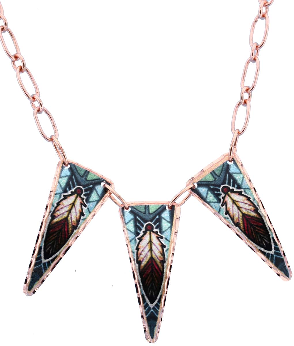 Colorful feather copper necklaces designed by Lynn Bean feather artwork with vibrant colors. This appealing colorful feather art necklace consists of three copper triangle pendants attached together with jump rings and handmade in a colorful feather design.