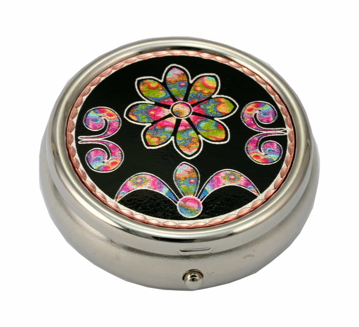 The colorful flower pill box is silver in color with plastic compartments and decorated with colorful copper artwork. Buy wholesale handmade flower gifts perfect addition to your gift store. Round rhodium-plated pill boxes are 4.5 cm in diameter and 2 cm high ( 1.78 inches in diameter and 0.79 inches high ) with plastic compartments. Looking for something exceptional for that hard-to-shop-for girlfriend? This luxurious decorative pill box will make an unusual gift for someone who has everything.
