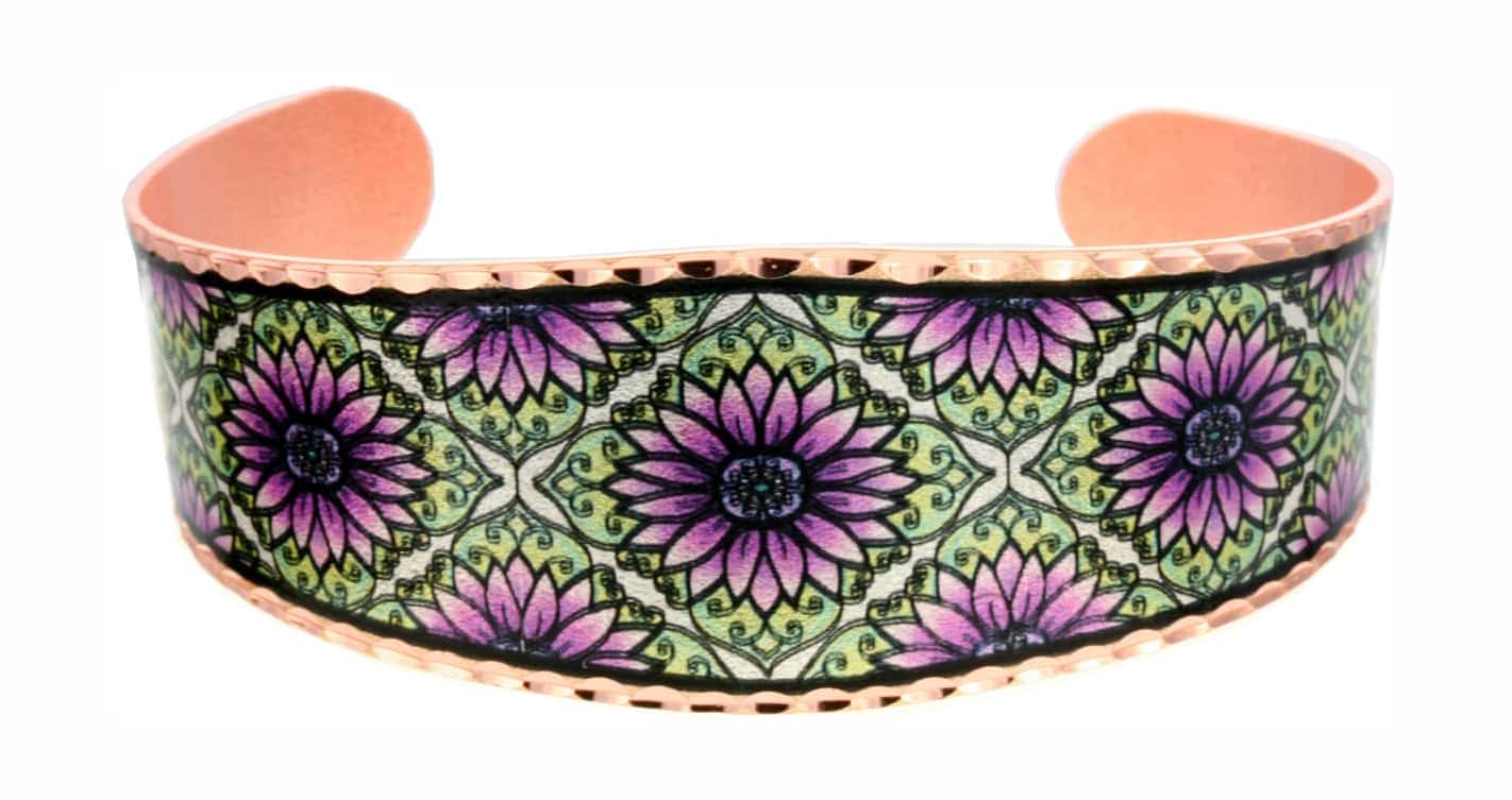 Colorful flower bracelet made from copper in gorgeous purple flower artwork. You can easily adjust the bracelets to your wrist to wear them comfortably. Whether you are looking for earrings that are original, looking for an everyday piece, or something one of a kind, we have the flower jewelry you have been looking for.