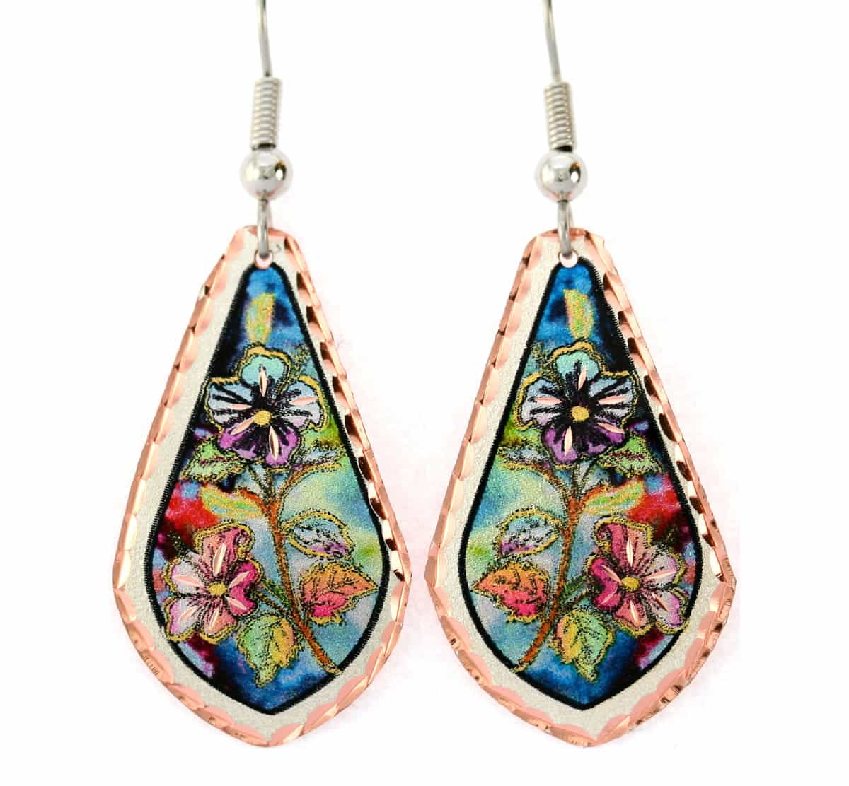 Lovely floral earrings with a brightly colored blue background. These flower earrings are handcrafted from copper so they are very lightweight and comfortable to wear.