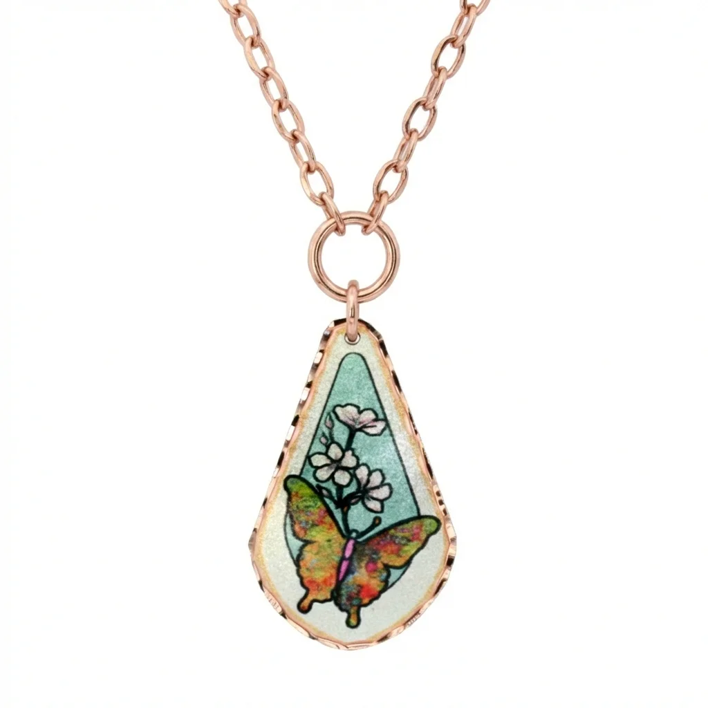 Add a touch of natural elegance to your wardrobe with our Colorful Flowers Butterfly Necklace. Handmade from silver-plated pure copper in a vibrant, colorful flowers and butterfly design, this pendant features hand-carved diamond cuts for a brilliant sparkle. Suspended on a beautiful 20-inch rose gold-plated chain and sealed with a no-polish acrylic finish, buy a butterfly necklace today that is amazingly unique, stylish, and built to last.