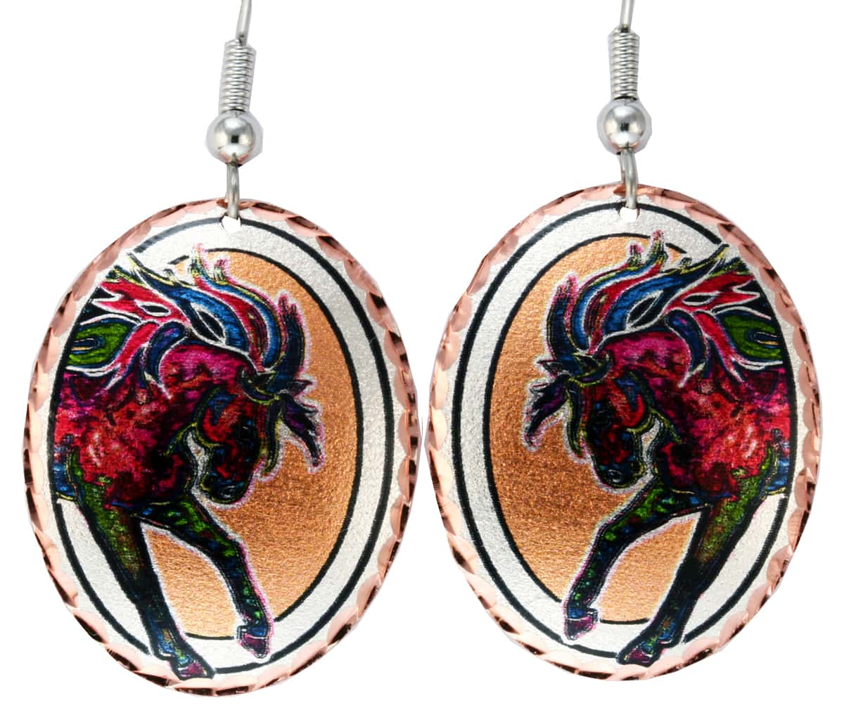 Bright and colorful horse earrings capture the free spirit and independence of horses. These handmade earrings are silver plated and diamond cut on copper to highlight this exceptional horse artwork.