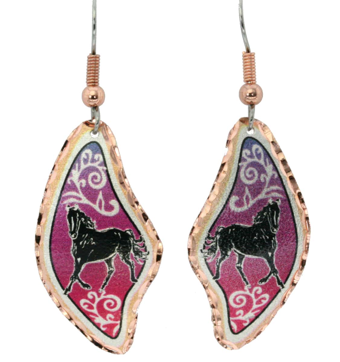 Horse jewelry created in this colorful horse earrings with a horse silhouette of a running horse and changing colors for the background from red to purple and to blue with swirly floral motifs.