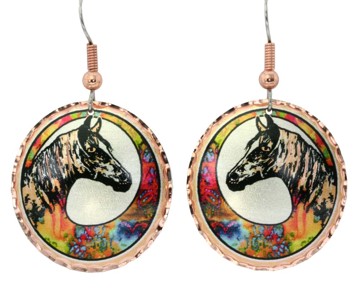Horse earrings created in striking colorful border design and silver background on this outstanding horse jewelry. Creative techniques and unique horse designs make our handmade horse jewelry truly unique to Copper Reflections. All the earrings have hypo allergenic surgical steel ear wires.