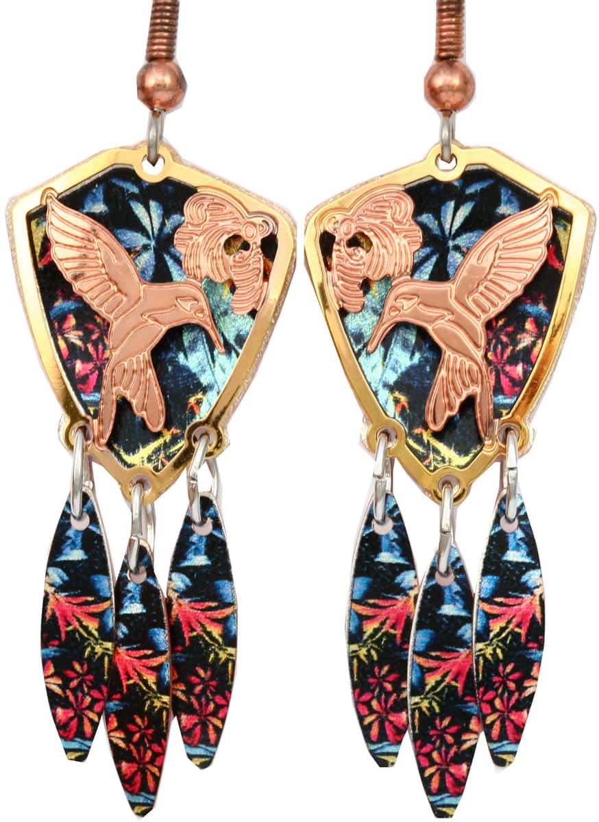 Hummingbird earrings are handcrafted in two tone gold and copper plated cut through design with colorful copper background and dangles.