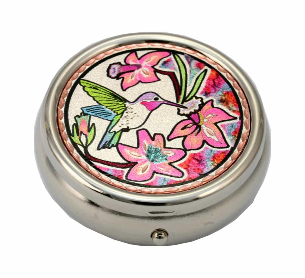 The unique hummingbird pill box is silver in color with plastic compartments and decorated with colorful copper artwork. Buy hummingbird gifts for women. Round rhodium-plated pill boxes are 4.5 cm in diameter and 2 cm high ( 1.78 inches in diameter and 0.79 inches high ) with plastic compartments. You can easily keep your pills organized using this awesome and best silver color pill case. Shop for a pill box embellished with hummingbird artwork that is the elegant and feminine best choice for women who love hummingbirds and nature. The hummingbird symbolizes devotion, permanence, and eternity. Although hummingbirds are small, they are known to fight ferociously to protect and defend their territory.