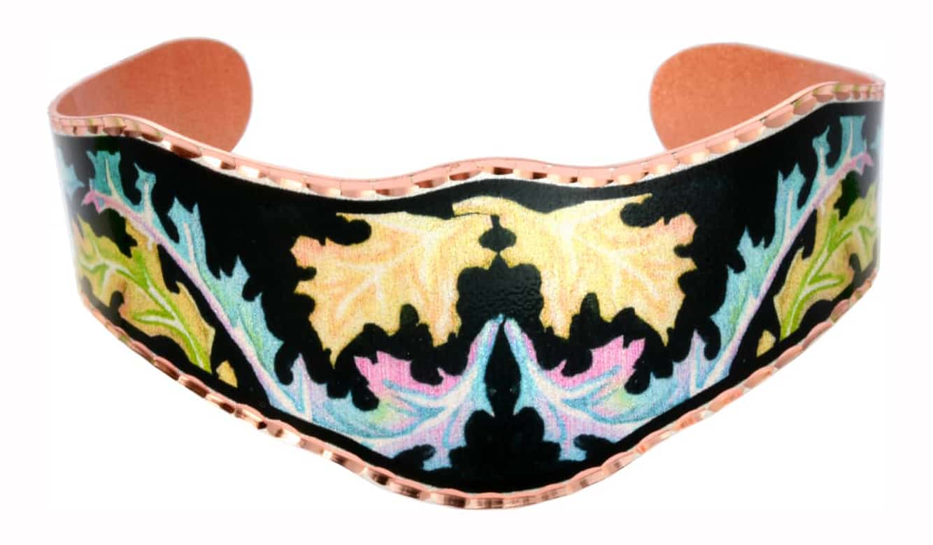 Copper bracelets are handcrafted, silver plated and diamond cut in this colorful leaves artwork by Lynn Bean. Gorgeous colors and fine details make these handmade bracelets extraordinary.