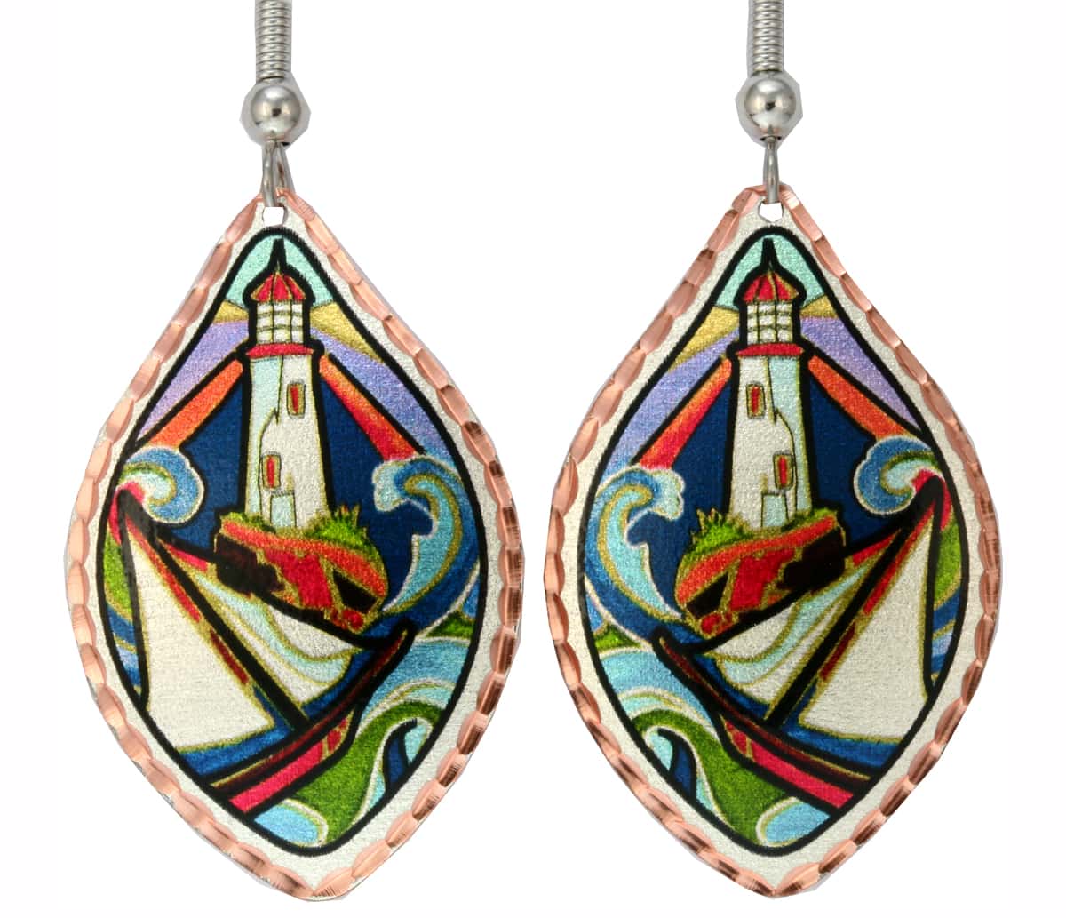 Dramatic colors are featured in this gorgeous artwork with Lighthouse and sailboat. These copper earrings are silver plated and diamond cut to accent this exceptional design.