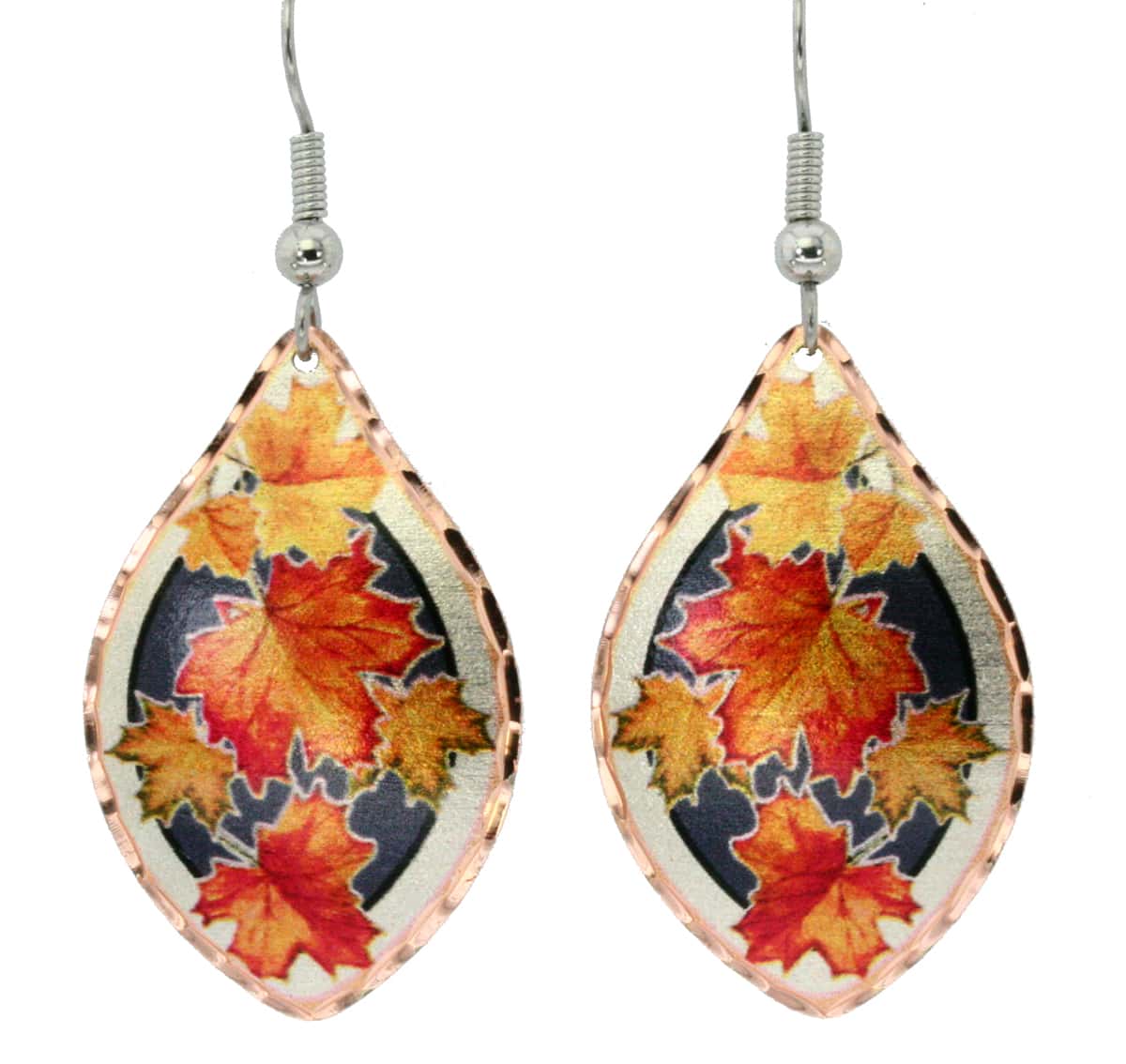 Maple leaves are created in falling leaves in autumn colors with dark blue background color. Unique earrings handmade in yellow, red, orange autumn leaves design.