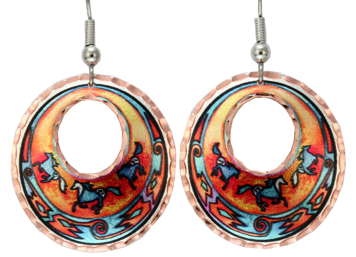 Colorful horse earrings inspired by Southwest Native petroglyph paintings are handcrafted, silver plated and diamond cut on copper earrings.