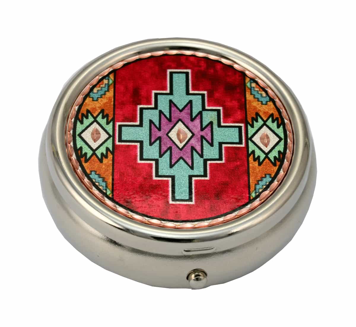 The colorful Native American pill box is silver in color with plastic compartments and decorated with colorful copper artwork. Buy wholesale handmade gifts by Copper Reflections. Round rhodium-plated pill boxes are 4.5 cm in diameter and 2 cm high ( 1.78 inches in diameter and 0.79 inches high ) with plastic compartments. Copper Reflections is the best online shop if you are looking for unique copper gifts that you can not find anywhere else. In the center is the butterfly symbol which represents rebirth, regeneration, and joy. The bold and vibrant colors on this handcrafted pill box are lively and will add a splash of color to your day.