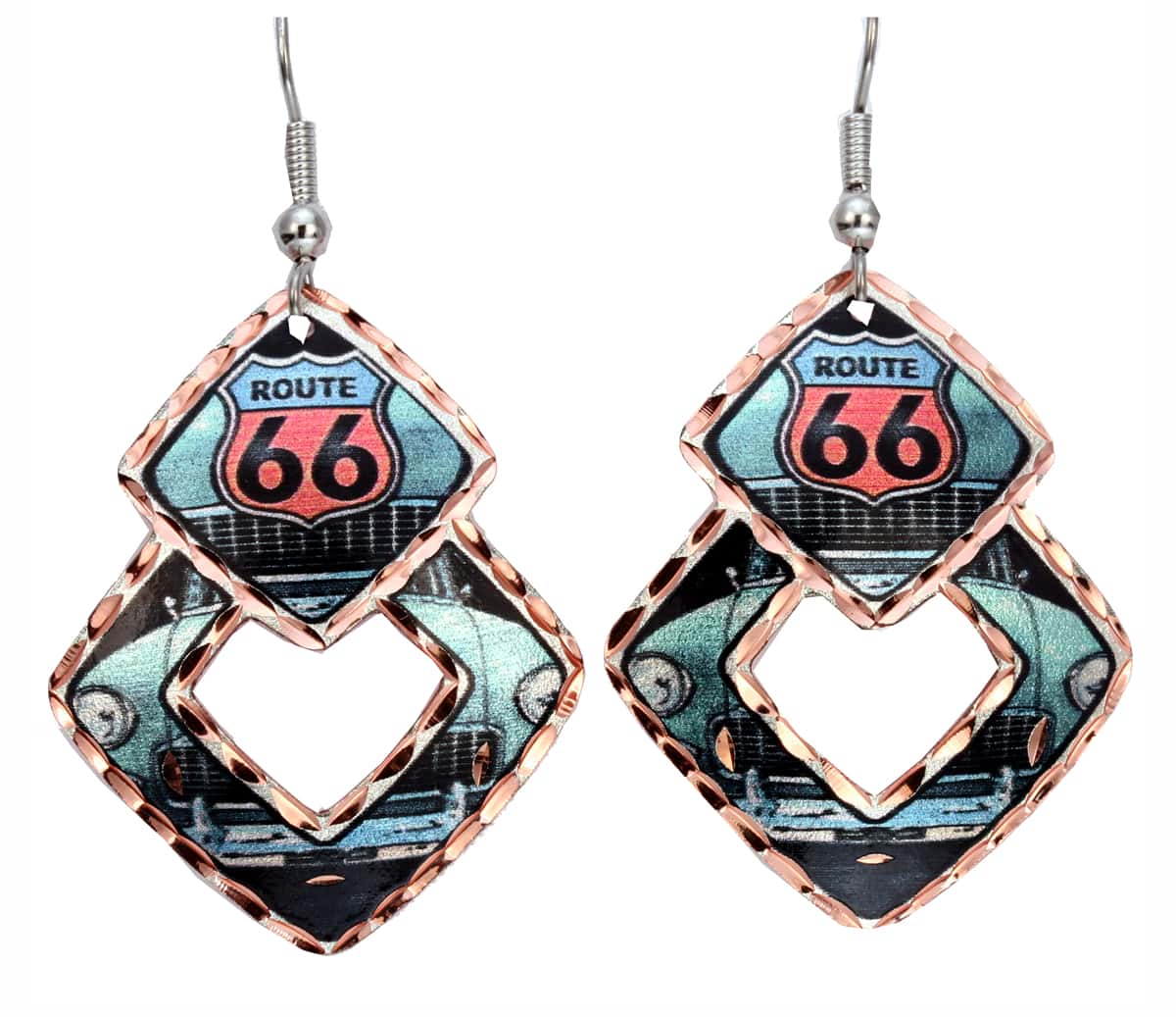 Colorful route 66 earrings are beautifully crafted from copper in the finest details and colorful artwork to impress everyone. Buy trendy and original earrings to remind you of all the wonderful memories you have. These pretty and feminine double square shape copper earrings are 27 mm x 34 mm ( about 1 x 1.3 inches ) in size. You found your perfect earrings that are handcrafted to perfection and make a standout addition to your collection.