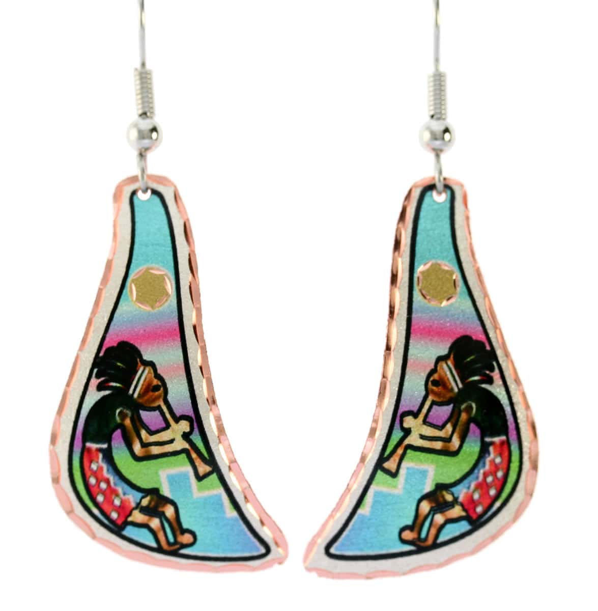These unique earrings are colorful and fun depicting Southwest Native Kokopelli design. In ancient Indian legends, the flute player was the symbol of happiness and joy, a fertility god, and a traveling prankster. Kokopelli embodies everything pure and spiritual about music. He talked to the wind and the sky. His flute could be heard in the Spring breeze, bringing warmth after the winter cold.