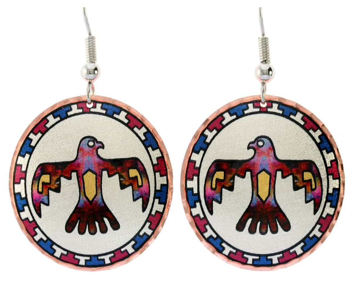Colorful Thunderbird earrings are handmade, silver plated and diamond cut on copper. The border pattern symbolize clouds. Some tribes view the Thunderbird as an omen of war. When thunder rattled the heavens this was foretelling of victory for tribal wars fought on the ground particularly when ritual ceremonies and dances were reverently adhered to in order to appease the Thunderbird and insure victory in battle.